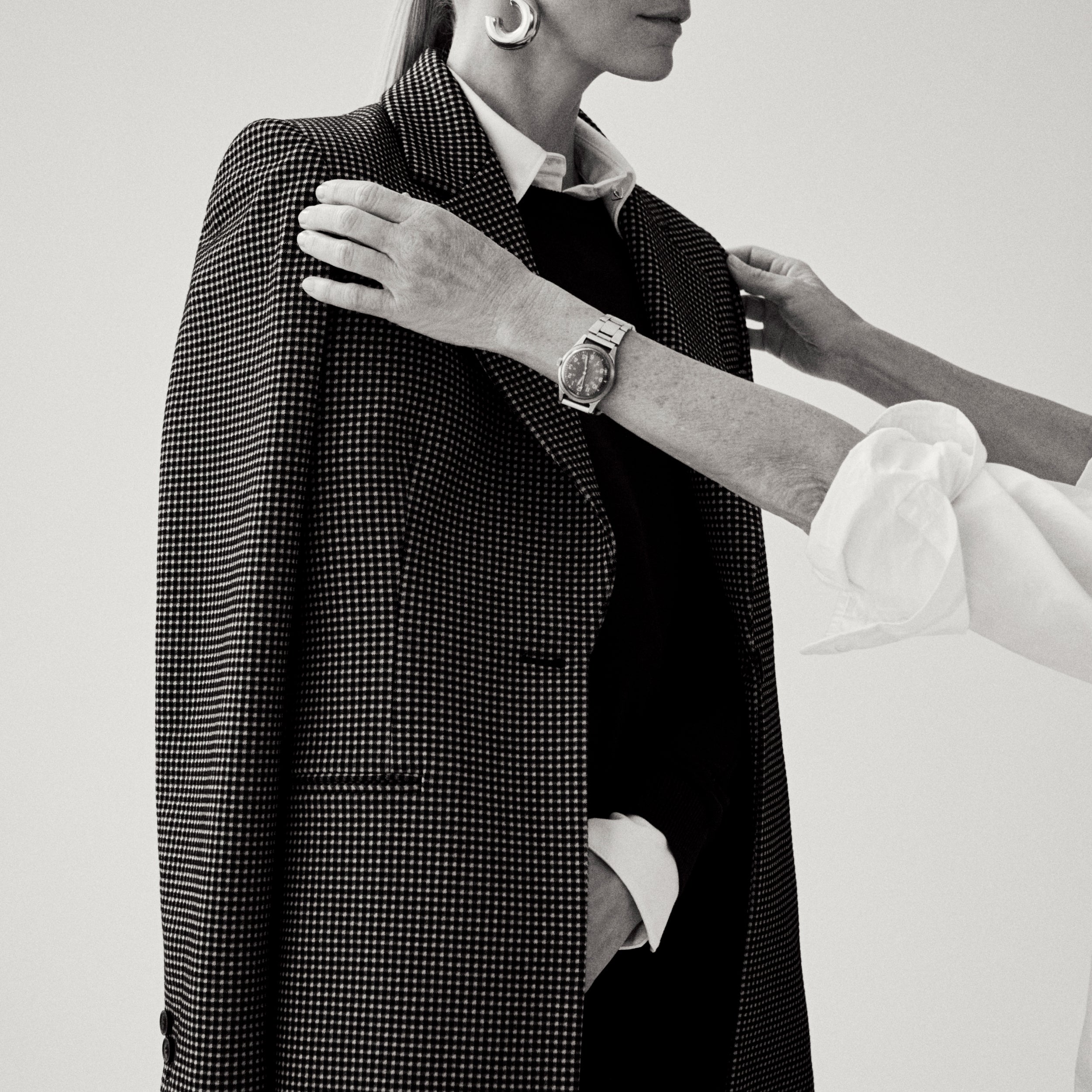 Woman wearing a gray checkered coat and pants with a patterned top against a beige background