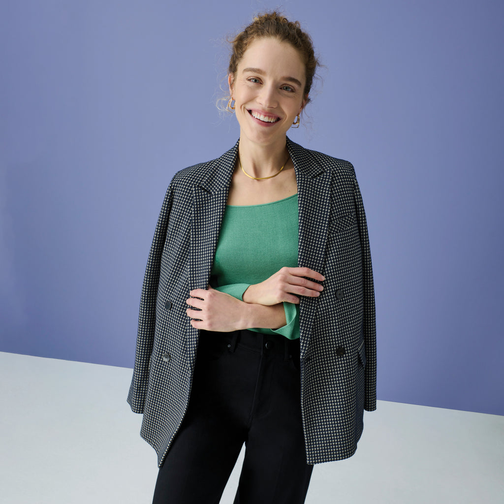 This sleek boyfriend blazer has a slightly boxy cut and a long hemline, balanced by a slim fit through the shoulders. PSA: This is a far cry from your grandmother’s houndstooth. Similar to our stretch foulard, this stretch houndstooth is shockingly soft and extremely wrinkle-resistant. It’s unlined through the body, so you can enjoy the natural stretch and coziness of the fabric. Once you feel it for yourself, you might wonder why all suiting doesn’t feel this way.
